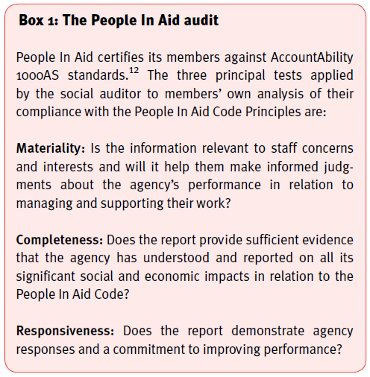 Box 1The People In Aid audit focuses on the extent to which adherence to the People In Aid Code is embedded in operational and management practices throughout the organisation, and the quality and effectiveness of consultation (see Box 1). See http://www.accountability.org/standards/index.html Members go through this process of certification for a number of reasons, including to demonstrate their accountability to their staff. For Save the Children UK, for example, Jasmine Whitbread, then CEO, said: ‘This award is recognition to [all our people] that we have made great progress in raising our standards, demonstrating our willingness to be held accountable and to achieve our ambition to be a great place to work’. Likewise, the Sierra Leone Red Cross identified a range of benefits from becoming certified. See http://www.peopleinaid.org/pool/files/pubs/sierra-leone-red-cross-society.pdf  In a statement the Society noted that it ‘wanted to obtain committed status [i.e. certification] in order to demonstrate that it values its workforce who collectively contribute to the achievement of its objectives’.