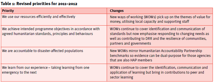 To address these issues we took a further step towards the other initiatives in which our members are engaged: mirroring the HAP benchmarks within our accountability to beneficiary ways of working; incorporating ideas from the Sphere Core Standards around coordination, collaboration and local capacity; and making explicit reference to People in Aid. To identify the ways of working which sit beyond the scope of these initiatives, we concentrated on areas where agencies had common aspirations (e.g. value for money) and where the first three years of DECAF showed there was still progress to be made (e.g. learning). While this process led to a very different set of ways of working, at the priority level there was only one significant change: a move away from using funds as stated towards a more challenging commitment to using resources efficiently and effectively. This new priority incorporates the themes of value for money, utilising local capacity and ensuring that staff can work effectively (see Table 1).