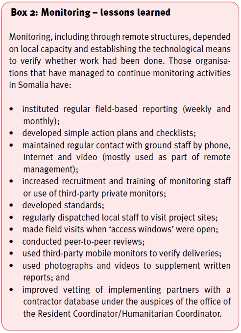 The humanitarian response to Somalia has largely been managed from Nairobi; decisions made, and those making them, have been removed from the field. This adds to the transaction costs of humanitarian operations as intermediary levels have been introduced to channel or administer funding and projects. Although most agencies agree that remote management is far from ideal, some organisations have accumulated knowledge and experience that others could usefully learn from, given that remote management appears to be here to stay. One important challenge of remote management in South Central Somalia is the heightened exposure of national staff to risks. There is considerable scope for humanitarian organisations to provide national staff with adequate security resources, support and capacity-building.