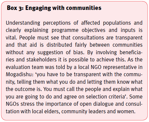 Few organisations adequately analysed the needs of IDPs according to place (urban or rural), cause of displacement (drought – pastoralist; conflict) or length of time displaced. According to local authorities and aid recipients interviewed the specific needs of displaced populations in host families, as well as host family needs, were largely overlooked. The diaspora has played a significant role in helping communities to cope with otherwise unsustainable stresses. While initiatives have been taken to foster stronger links between the humanitarian community and private actors, further steps are needed to ensure that humanitarian efforts are coordinated more closely with the support received from the diaspora and other private sources.
