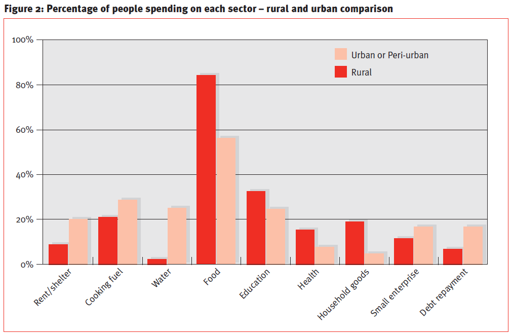 By comparing how cash was used in rural and urban/peri-urban areas (Figure 2), the versatility of cash becomes clear. People in urban locations had greater shelter, fuel, water, debt and small business needs, whereas in rural areas 28% more people prioritised food.
